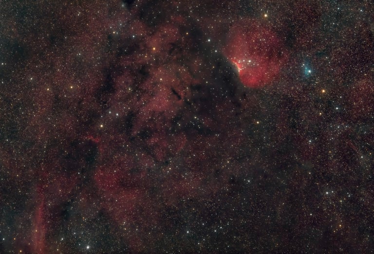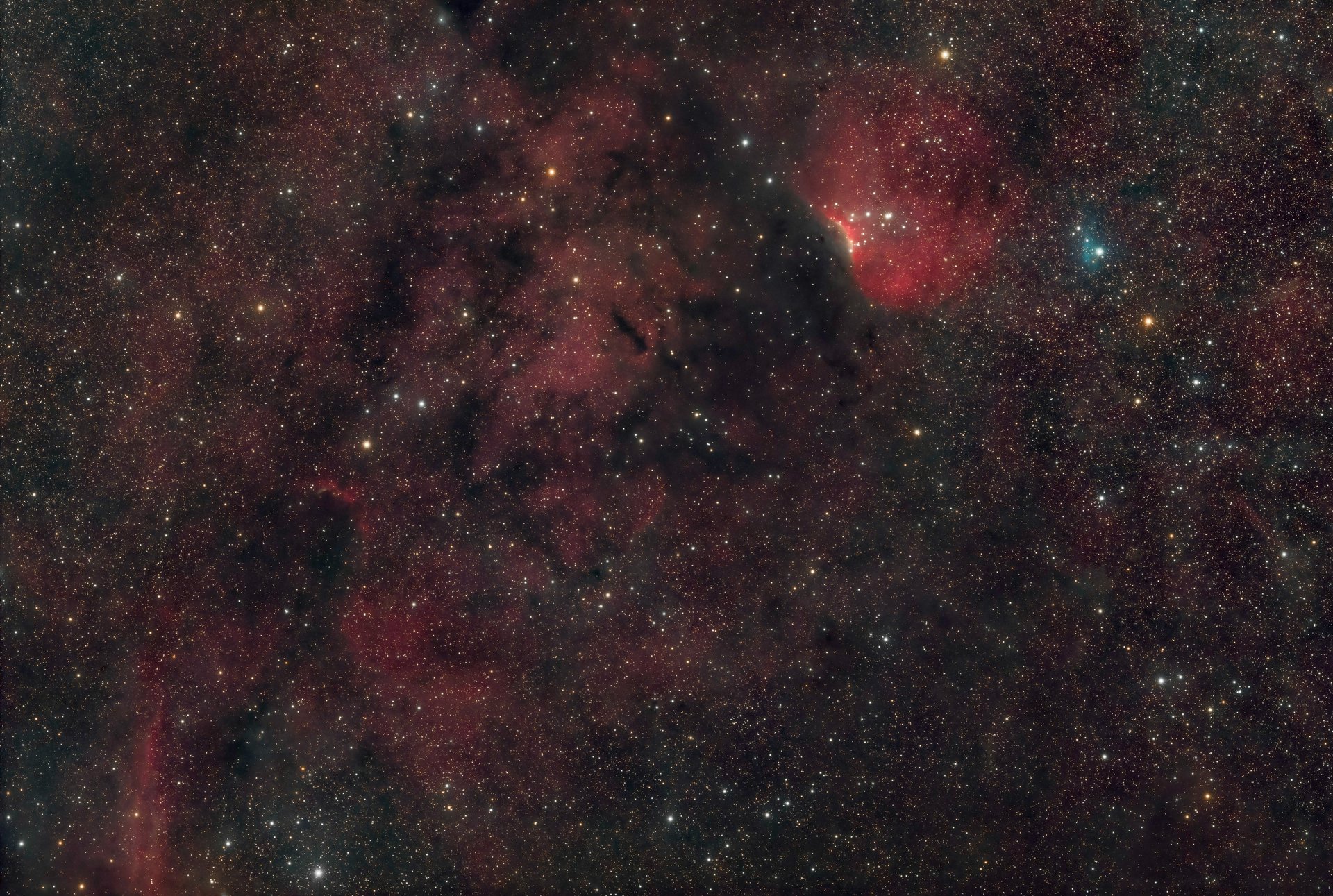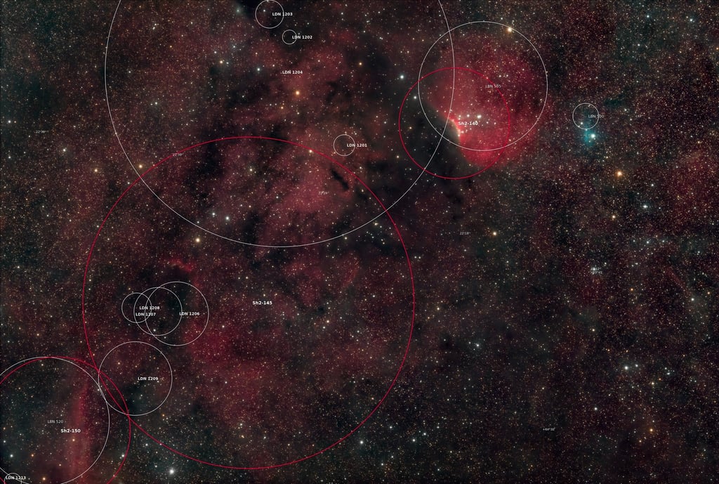 Voici une vue dans la constellation de Céphée ou nous pouvons admirer trois objets de cette liste mais aussi de nombreux objets du catalogue LDN (Lynds Dark Nebula) :