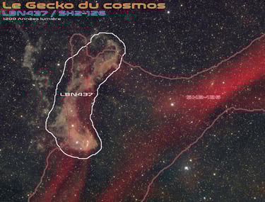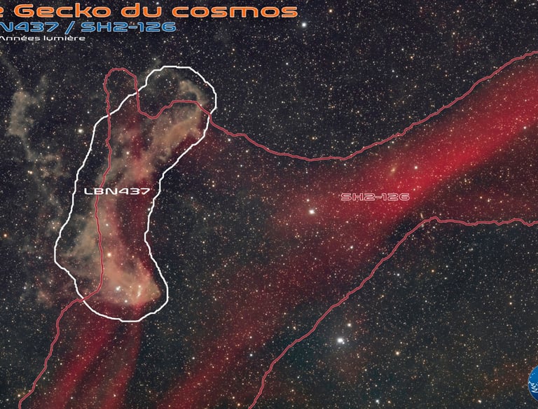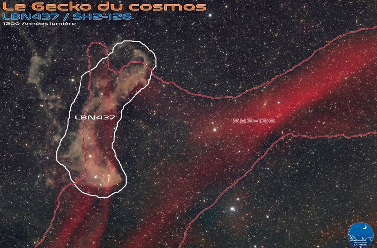 En effet, Le nuage moléculaire LBN-437 souvent appelé le "Gecko" est ici traversé par la nébuleuse en émission SH2-126 (la teinte rouge) composée d'hydrogène Ionisé (HA).