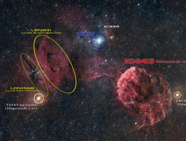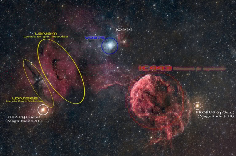 Une cible bien connue des astrophotographes dans la constellation des Gémeaux, la méduse (IC443), comporte en champ large d'autres objets très intéressants :