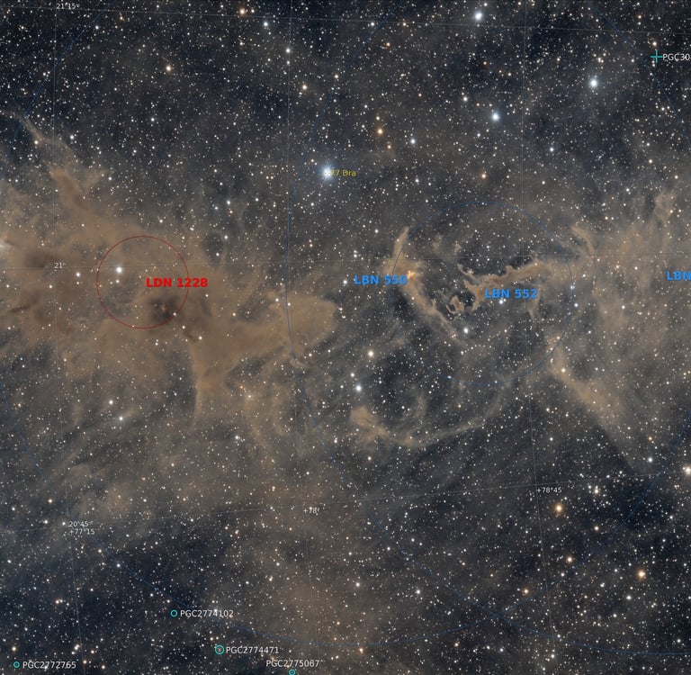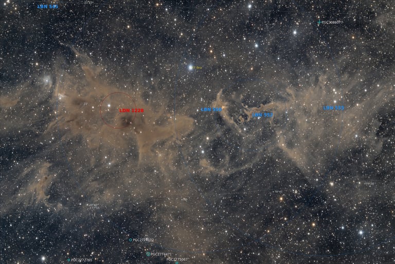La région de LDN1228 avec son petit groupe d'objets LBN (Lynds Bright Nebulae), une zone très dense dès que l'on accumule du temps de capture.