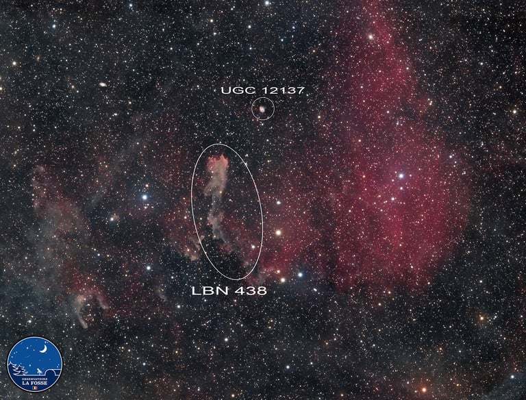 Je continue à me balader dans la constellation du lézard...Numéro 438 du catalogue LBN (Lynd's Bright Nebula), il rappelle un peu (en moins spectaculaire) la formation CG4 (la main de dieu).