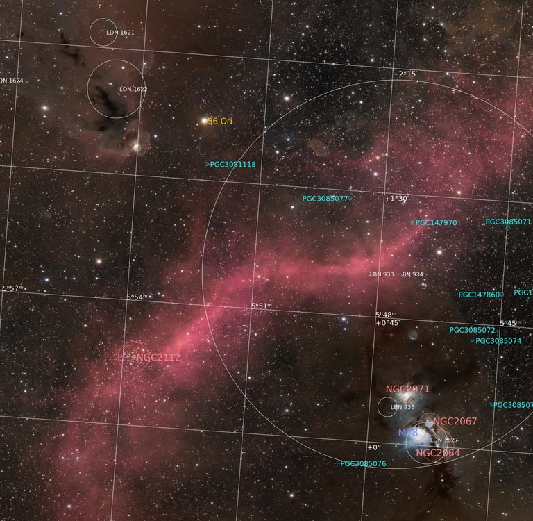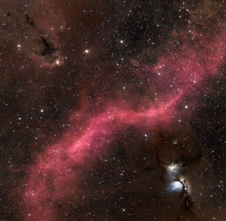 Cette vue nous propose un étonnant mélange entre nébuleuses en réflexion , nébuleuses en émission et nébuleuses sombres.