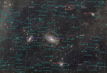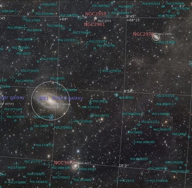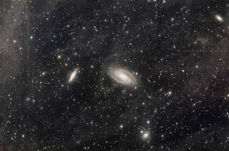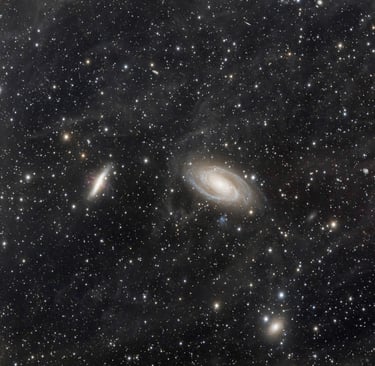 Voici donc un grand champ centré sur M81 (NGC 3031) et M82 (NGC 3034) situées respectivement à environ 12,0 et 12.7 millions d'années lumière de notre Voie Lactée.