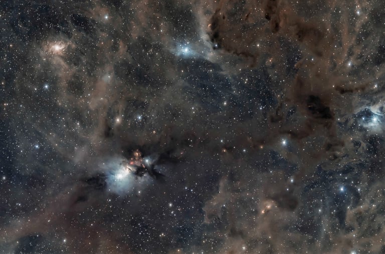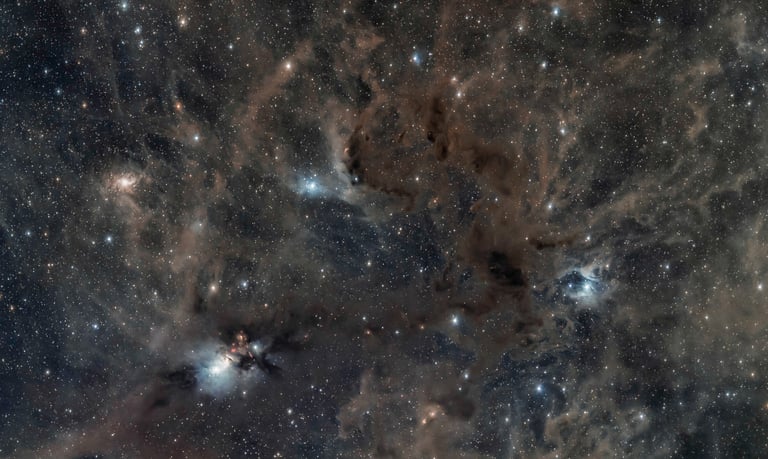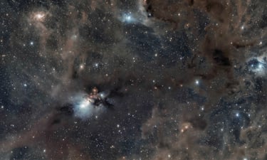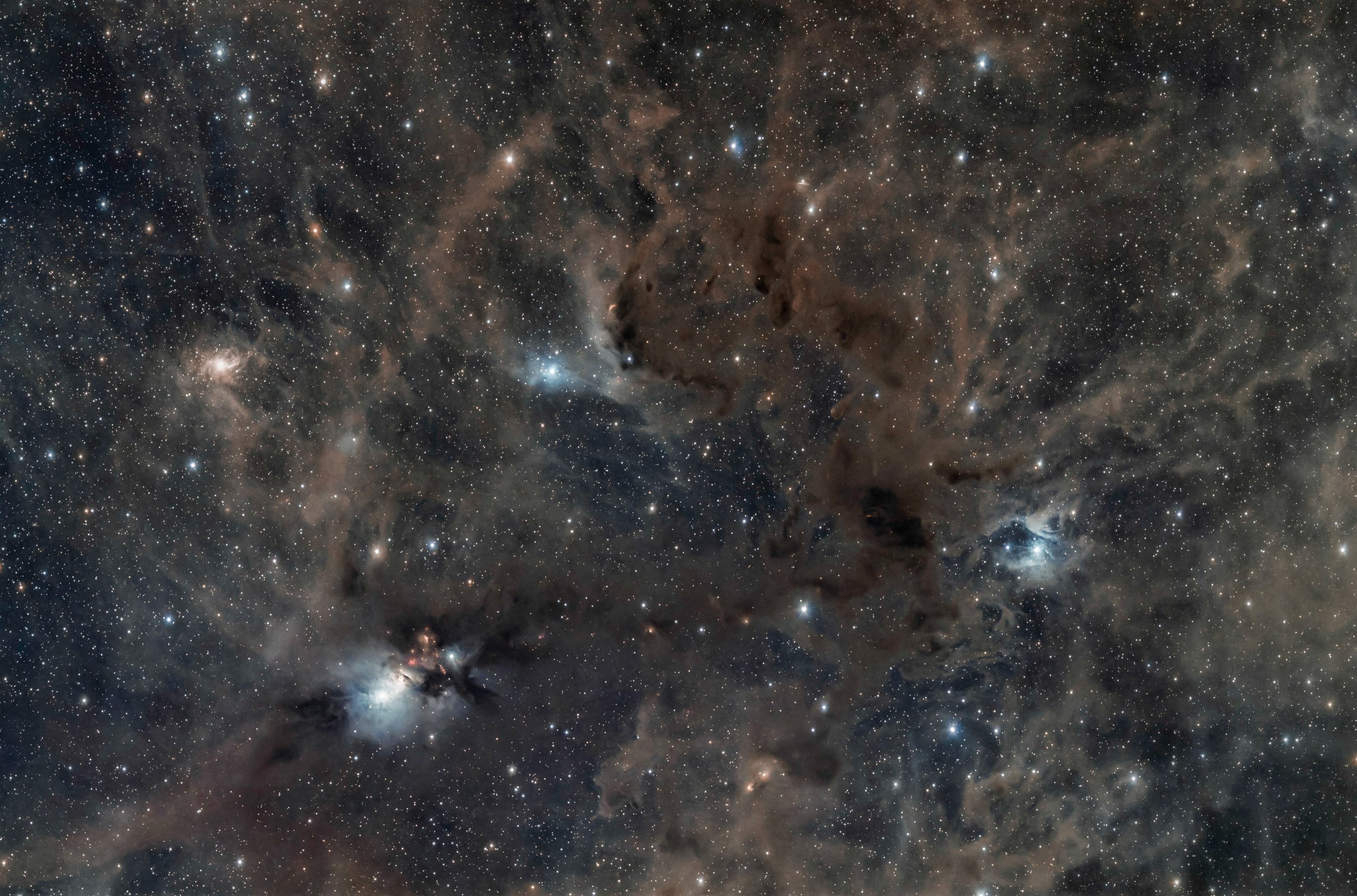 De nombreux nuages sombres parsèmes la photo, nous pouvons y voir LDN1450 ainsi que Barnard 203 et Barnard 205.
