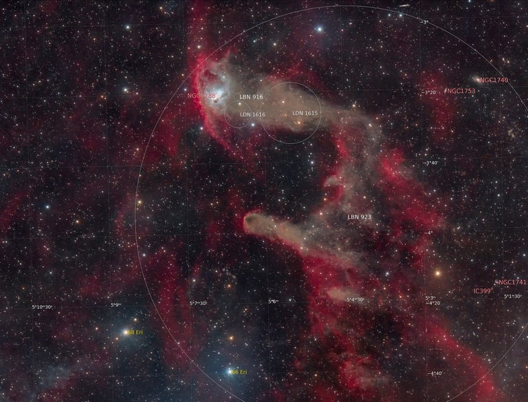 Deux nuits ont été nécessaires pour la réalisation de cette image qui nous présente une belle nébuleuse par réflexion (NGC1788) entournée par des objets des catalogues LDN et LBN.