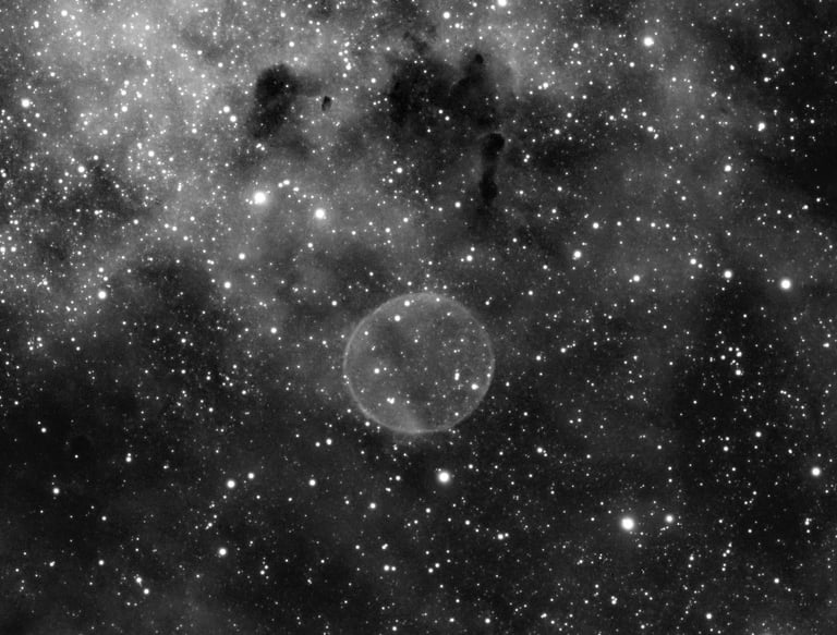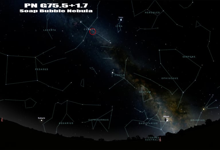 Une petite et discrète bulle dans le CygneJe m'attaque ici à un objet assez difficile : la "bulle de savon" (PN G75.5+1.7), très proche d'une cible bien plus facile et connue : NGC 6888 (le croissant).